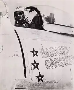 Barcus personally flew numerous combat missions in his Sabre jet, often taunting enemy forces over the radio while striking key targets. On May Day, he led a daring 50-plane Sabre raid against the North Korean army headquarters and radio station just north of Pyongyang, one of the most heavily defended anti-aircraft positions in enemy territory. The strike was executed with such speed and precision that the American jets were clear of the target before enemy gunners could react. In another mission, Barcus led a strike that pushed all the way to the Yalu River, the border of Manchuria. Though he never engaged Communist MiG jets directly, he spotted two during the Yalu River mission, both retreating toward safety.[25]