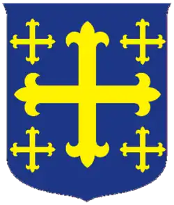 | Shield | Azure a cross flory between four like crosslets Or. |