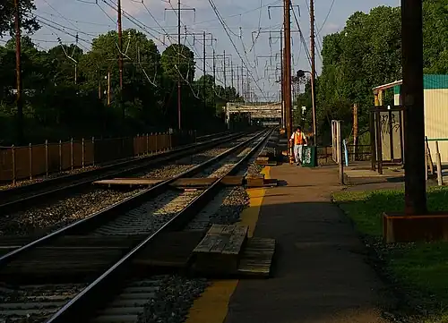 Glenolden station platform as seen from the south side of the tracks looking east. | ||||||||||||||||||