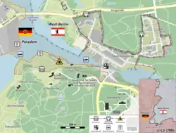 The Glienicke Bridge was a restricted border crossing between the Eastern Bloc, via Potsdam in East Germany, and territory affiliated with the Western powers, the American sector of West Berlin.[3] Because of this, Americans and Soviets used it for the exchange of captured spies during the Cold War, with the bridge directly controlled, not by the GDR, but by the Soviet Union.[3]