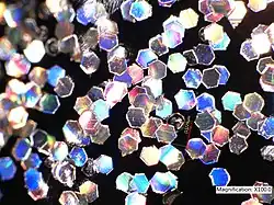 Today over 20,000 varieties of glitter are manufactured in a vast number of different colors, sizes, and materials.[18] One estimate suggests 10 million pounds (4.5 million kilograms) of glitter was either purchased or produced between the years of 1989 and 2009, however the source[19] provides no evidence or reference point. Commercial glitter ranges in size from 0.002 to .25 inches (0.05 to 6.35 mm)[20] a side. First, flat multi-layered sheets are produced combining plastic, coloring, and reflective material such as aluminium, titanium dioxide, iron oxide, and bismuth oxychloride. A common plastic is PET plastic, but mica can be used.[21][5] These sheets are then cut into tiny particles of many shapes, including squares, triangles, rectangles, and hexagons.[20]
