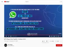 "Every Woman Every Child" funded[10]MTV Shuga and Viacom CBS Africa responded to the 2020 pandemic by creating the mini-series MTV Shuga Alone Together, which highlighted the problems of the COVID-19 pandemic.[11] During the series the characters talk to each other about life during the lockdown.[12] The mini-series was designed for 60 nights. The series is based in Nigeria, South Africa, Kenya and Côte d'Ivoire. All of the filming is done by the actors themselves,[11] who include Jemima Osunde, Lerato Walaza, Folu Storms, Mamarumo Marokane and Mohau Cele.
