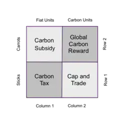 Delton Chen calls this relational diagram the carbon pricing matrix.[4] The matrix denotes four market policies: the (1) carbon tax, (2) carbon subsidy, (3) cap and trade, and (4) global carbon reward. The left side of the carbon pricing matrix is consistent with Arthur C. Pigou’s 1920 treatise on externalised costs and his proposed method of pricing negative externalities with taxes, and pricing positive externalities with subsidies. The objective of the carbon tax is ostensibly to achieve allocative efficiency by internalising the SCC. In standard economics there is no mention of an explicit objective when using the carbon subsidy, although such subsidies have been used, such as the 45Q tax credit in the United States for carbon oxide capture and sequestration.[21]