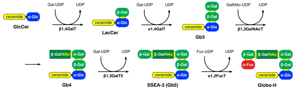 Globo H's biosynthetic pathway is involved in the synthesis pathways of other globo-series glycosphingolipid antigens that are also specific to cancer cells, including stage-specific embryonic antigen-3 (SSEA3) and stage-specific embryonic antigen-4 (SSEA4).[1] The biosynthetic pathway of these antigens includes the enzyme β 1,3-galactosyltransferase V (β3GalT5).[1] β3GalT5 catalyzes the galactosylation of globoside-4 (Gb4) to SSEA3.[1] SSEA3 can then be converted to SSEA4 by sialyltransferase adding a sialic acid group to its end, or it can be converted to Globo H by fucosyltransferase adding a fucose ring to its end.[1] Playing a part in the formation of three different cancer-specific antigens, β3GalT5 is of particular interest in its relevance to cancer treatment, and it has been shown to be critical for cancer cell survival.[8]