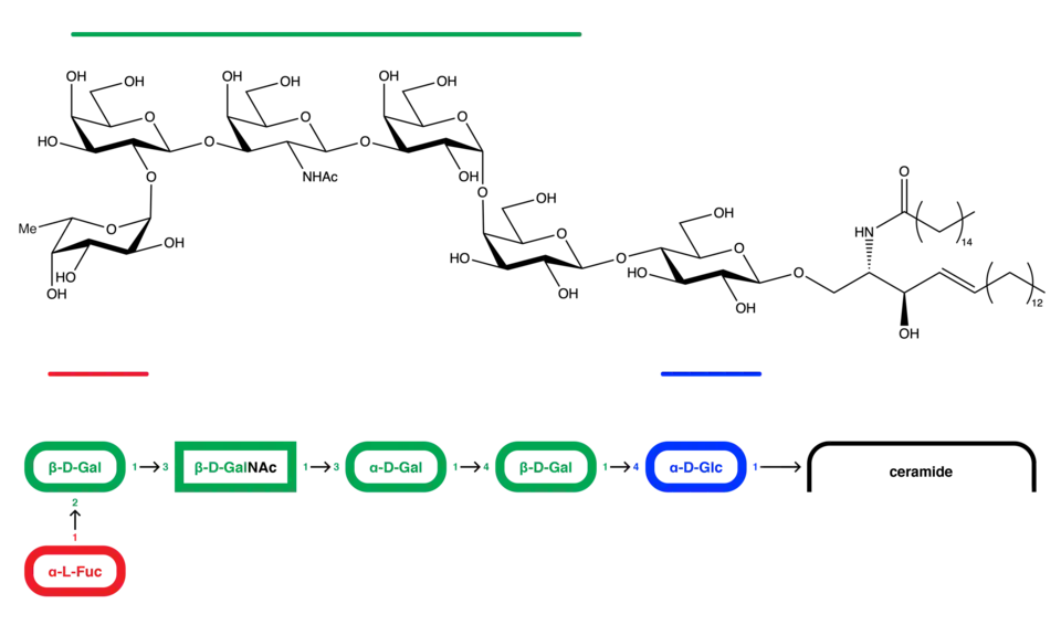 Defined by the monoclonal antibody MBr1, Globo H has been isolated from breast cancer cell line MCF-7, and its structure has been determined through several analyses, including NMR spectroscopy and methylation analysis.[5] Globo H consists of a hexasaccharide of the structure Fucα(1-2)Galβ(1-3)GalNAcβ(1-3)Galα(1-4)Galβ(1-4)Glcβ(1) with a ceramide attached to its terminal glucose ring at the 1 position in a beta linkage.[6]