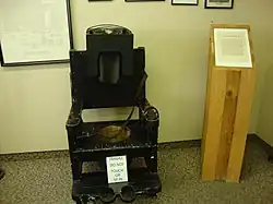 Some of the most notable exhibits are the full-sized models, built by Glore, of treatment devices from the 16th, 17th, and 18th centuries.[1] One such item is a "Tranquilizer Chair", complete with hood, hand and feet restraints and a built-in portable toilet to accommodate extended sessions.[2][5] The chair was invented by Benjamin Rush, known as "The Father of American Psychiatry", who published the first American textbook about mental illness in 1812.[5]
