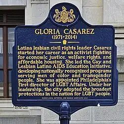 - ^ "First Latinx Pennsylvania Historical Marker Dedicated at City Hall for Gloria Casarez". William Way Community Center. September 29, 2021. Retrieved May 3, 2022.