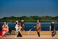- Dramatic scenes in kabuki (縁切/愛想づかし) depicting forced separation of lovers, typically accompanied by music and often leading to tragic consequences. Features stylized expressions of hidden emotions and misunderstandings.