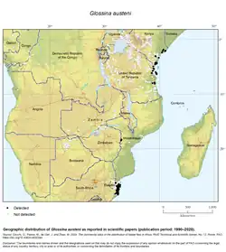Glossina austeni was known to occur in African countries along the eastern coast, from South Africa to Somalia, but also including Eswatini and Zimbabwe.[3] Except for Somalia where data are lacking, the peer-reviewed scientific literature for the period 1990–2020 corroborate earlier reports with Glossina austeni detected in 6 countries;[4] Eswatini,[5] Kenya,[6] Mozambique, South Africa,[7] and the United Republic of Tanzania.[8] In Zimbabwe the latest reports date back to 1992 from an area bordering Mozambique,[9] but more recent surveys from the area did not confirm the presence of the species.[10]