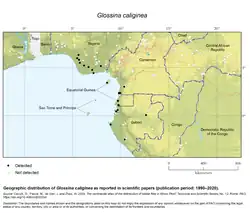 Glossina caliginea was known to be present in seven countries in Africa: Cameroon, the Central African Republic, the Republic of the Congo, Equatorial Guinea, Gabon, Ghana and Nigeria. However, in the peer-reviewed scientific literature for the period 1990-2020, data on its occurrence was only available for four contiguous countries in central Africa and western Africa, i.e. Cameroon, Equatorial Guinea, Gabon and Nigeria.[1] In Equatorial Guinea the species was detected in sympatry with other tsetse species of the palpalis and fusca groups, and in particular with the more abundant and widely distributed Glossina palpalis palpalis.[2][3][4] All the studies that reported the presence of G. caliginea in Equatorial Guinea in the period 1990-2020 were carried out in sleeping sickness foci, i.e. Campo, Mbini and Kogo, while in Nigeria, the species was reported from a single study in the Niger Delta Region.[5] Before 1990, reports or suggestions of G. caliginea occurrence also included the Central African Republic,[6] the Republic of the Congo[7] and Ghana.[8]