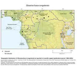 Glossina fusca congolensis mainly occupies the eastern part of the geographical range of Glossina fusca, from Nigeria to the Central African Republic, even though, since its distribution overlaps in some areas with that of Glossina fusca fusca, the main transition area between the two subspecies is not well delineated. In a review of the scientific literature from 1990 to 2020, G. fusca congolensis was reported from four countries; Cameroon,[4][5] the Central African Republic,[6] Gabon and Nigeria.[7][8]