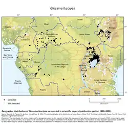 - ^ a b c d e f g h Cecchi, G.; Paone, M.; de Gier, J.; Zhao, W. (2024). The continental atlas of the distribution of tsetse flies in Africa. PAAT Technical and Scientific Series, No. 12. Rome: FAO. doi:10.4060/cd2022en. ISBN 978-92-5-139040-5.