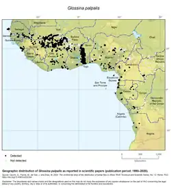 Glossina palpalis is known to be present in 20 countries in western Africa and central Africa, stretching from Senegal to Angola.[1][3] Data on its occurrence in the peer-reviewed scientific literature for the period 1990–2020 is available for 16 countries;[4] Angola, Burkina Faso,[5] Cameroon, the Central African Republic, Congo, Côte d'Ivoire, the Democratic Republic of the Congo, Equatorial Guinea, Gabon, the Gambia, Ghana, Guinea, Mali,[6] Nigeria, Senegal and Togo, while reports from Benin, Guinea-Bissau, Liberia and Sierra Leone date back to earlier periods,[3][7] or they have not been published in the peer-reviewed scientific literature.[4]