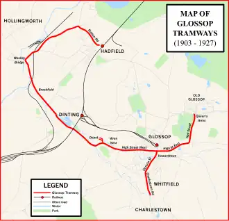 The Glossop Tramway was a 4.5-mile (7.2 km) long passenger tramway service connecting the mill towns of Glossop and Hadfield in Derbyshire, England.[1] It was authorised by the Board of Trade in 1901 and was opened in 1903 on a gauge of 4 ft 8+1⁄2 in (1,435 mm). It was closed in 1927, with the branch to Whitfield closing in 1919.