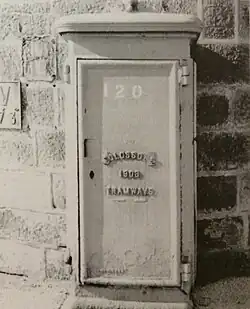 Underground cables from the power plant paralleled the track, with a cast iron feeder pillar (or box) every half mile, from which the current was fed up to the overhead wires, through wires in the tram poles. Each pillar contained switches and fuses to allow isolation of both the underground cables and overhead wires if anything went wrong in any half-mile section. Telephone cables ran alongside the tramway cables, with telephones in all the feeder pillars to enable communication with the generating station.[5]