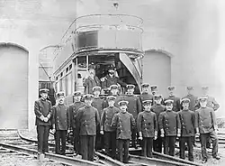 Employees of Glossop Tramway wore at least two uniforms over its twenty-four years. It began by issuing a militaresque outfit consisting of a double-breasted tunic with five pairs of buttons and upright collars, which bore metal insignia stating 'UESCo' on one side and the employee's number on the other, and peaked caps with a brass badge reading either 'Motorman' or 'Conductor' in script lettering.[6]
