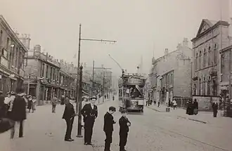 The UESCo appointed local magistrate and electrical engineer Charles Edward Knowles was appointed manager of the project,[2] and Leo Arthur Hards MIEE, an expert electric tramway engineer with the UESCo, was given responsibility for the layout of the system.[3] It was planned as a 4-mile (6.4 km) inverted 'C', with the north-west terminus in Hadfield, and the north-east at Old Glossop, joining relatively undeveloped stretches of roadway peppered with factories and large mills. A half-mile spur, known as the Whitfield Branch, ran south of the main track to Charlestown. The route was planned to be standard gauge, like other tramways in the Manchester region, powered by overhead catenary, and single-track with passing loops. For the depot and power station, a site on the north bank of the Glossop Brook at Dinting was selected. Tracklaying began in December 1902. Seven open top, double decker tramcars with reversed stairs were ordered.[2]