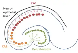 Neural progenitors that become hippocampal principal neurons (pyramidal and granular cells) arise from the ventricular zone of the lateral ventricle. In contrast to neural proliferation that leads to cortical formation, hippocampal precursors are produced directly in the ventricular zone because there is no subventricular zone or outer subventricular zone adjacent to the hippocampus.[1][2][3] Pyramidal CA1 and CA3 precursor cells, therefore, do not have to migrate far to reach their final destination. The figure to the right indicates migration of pyramidal neurons forming the CA3 (orange) and CA1 (red) cell body layers. These cells populate the hippocampus early in development and can be morphologically distinguished from one another in the embryo by 4 months.[2] Granular cells populate the hippocampus slightly after pyramidal cell migration.[2] These cells have farther distance to travel and follow along the pyramidal cells before entering the hilus; this is represented in the figure as the continuation of migration with the green arrows. Granular cell precursors that will populate the dentate gyrus proliferate locally in the hilus.[2] This area, also known as the subgranular zone, retains a portion of neurogenic precursors in the adult.[1]