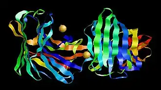 Glutamic proteases are a group of proteolytic enzymes containing a glutamic acid residue within the active site. This type of protease was first described in 2004 and became the sixth catalytic type of protease.[1] Members of this group of protease had been previously assumed to be an aspartate protease, but structural determination showed it to belong to a novel protease family. The first structure of this group of protease was scytalidoglutamic peptidase, the active site of which contains a catalytic dyad, glutamic acid (E) and glutamine (Q), which give rise to the name eqolisin. This group of proteases are found primarily in pathogenic fungi affecting plant and human.[2]