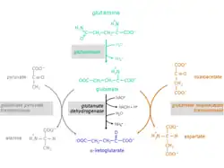 The conversion of the amino acid glutamine to α-ketoglutarate takes place in two reaction steps: