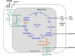 Glutaminolysis takes place in all proliferating cells,[3] such as lymphocytes, thymocytes, colonocytes, adipocytes and especially in tumor cells.[1] Glutaminolysis has been targeted for therapeutic purposes.[4] In tumor cells the citric acid cycle is truncated due to an inhibition of the enzyme aconitase (EC 4.2.1.3) by high concentrations of reactive oxygen species (ROS)[5][6] Aconitase catalyzes the conversion of citrate to isocitrate. On the other hand, tumor cells over express phosphate dependent glutaminase and NAD(P)-dependent malate decarboxylase,[7][8][9][10] which in combination with the remaining reaction steps of the citric acid cycle from α-ketoglutarate to citrate impart the possibility of a new energy producing pathway, the degradation of the amino acid glutamine to glutamate, aspartate, pyruvate CO2, lactate and citrate.