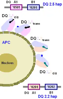 - ^ HLA-DQ8 generally refers to DQ8.1, DQA1*0301:DQB1*0302 but DQA1*0301 and DQA1*0303 can produce the same functional isoform, rarely DQA1*0503 is in the DQ8 haplotype, it has no known association with disease