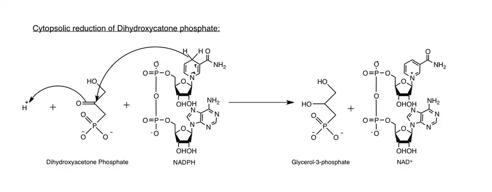 Cytosolic Glycerol-3-phosphate dehydrogenase (GPD1), is an NAD+-dependent enzyme[8] that reduces dihydroxyacetone phosphate to glycerol-3-phosphate. Simultaneously, NADH is oxidized to NAD+ in the following reaction: