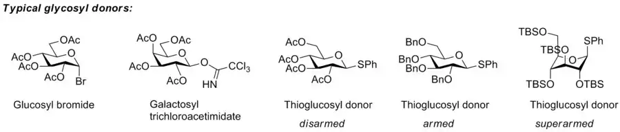 The concept of armed and disarmed glycosyl donors refers to the increased reactivity of benzylated over benzoylated glycosyl donors, a phenomenon observed very early,[2] and which originates from the greater electron-withdrawing capability of ester blocking groups over ether blocking groups. However, it was Bertram Fraser-Reid who realised that benzylated glycosyl donors can be activated when benzoylated donors are not, and invented the terms armed glycosyl donor for the former, and disarmed glycosyl donor for the latter. He and his group showed that armed glycosyl donors could be coupled to a glycosyl acceptor, that was at the same time a disarmed glycosyl donor, without self-coupling of the disarmed donor/acceptor.[3] This approach allowed him to carry out a one-pot synthesis of a trisaccharide by the n-pentenyl glycoside method.[4]