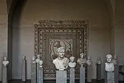 The Glyptothek keeps a large collection of Roman busts, among the most famous ones are the busts of Gaius Marius and Sulla (c. 40 BC), the Emperors Augustus (c. 40 AD), Nero (65 AD), Septimius Severus (200 AD) and his wife Julia Domna (195 AD). A heroised statue portrays Domitian as prince (70/80 AD). With the support of the cultural foundations of the German states, the Glyptothek was able to acquire in 2017 a bust of Caligula (c. 40 AD), excavated in Córdoba in 1937. The Emperor, like the Munich portrait of his ancestor Augustus (Augustus Bevilacqua), bears the corona civica. As a head of Tiberius has long been in the Glyptothek and a head of Claudius (Claudius Jucker) was donated in 2012, the Glyptothek owns portraits of all five emperors of the Julio-Claudian dynasty. To the major attractions belong also a colossal statue of Apollo (1st/2nd centuries AD) from a Roman villa in Tuscany, several Roman sarcophagus reliefs and mosaic floors. The marble statue of Artemis as mistress of the animals dates from 50 AD. An imitation of the classical style is the Roman head of a youth in bronze (ca Christ's birth). The Roman period is also represented by several reliefs (Relief of gladiators, 1st century BC) and mosaics (Aion mosaic, c. 200–250 AD).