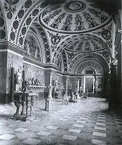The museum was originally built completely out of marble. However, during World War II the museum was bombed, and later reconstructed. The walls from the interior are composed of red brick and painted with a light plaster. The interior has domed vaulting.