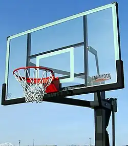 The basket consists of a metal ring 18 inches (46 cm) in internal diameter, suspended horizontally 10 feet (3.0 m) above the floor such that the center of the ring is equidistant from each sideline and 5 feet 3 inches (1.60 m) from the end line. The basket ring has a net attached below to briefly check the ball's downward progress and indicate a score. The ring is fastened to a rectangular backboard 6 feet (1.8 m) wide by 3.5 feet (1.1 m) tall,[18][19] though in lower levels of play or recreational use the backboard may be smaller and/or fan-shaped. The entire structure is supported from behind and anchored to the floor beyond the end line at higher levels of play; the structure may be anchored to a wall or ceiling at lower levels of play.[19] The ring, net, and the front, top, bottom, and sides of the backboard are all considered inbounds, while the back of the backboard and the support structure – even those parts suspended over inbounds areas of the court – are considered out of bounds.