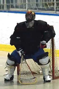Goaltending in box lacrosse tends to be more like goaltending in ice hockey than field lacrosse.[26] The box goalie's stance is similar to an ice hockey goalie. The goalie crouched, but with his knees spread, not pinched like in ice hockey. Heels shoulder-width apart, toes generally pointed on an outward angle to allow for stepping into the shot. One hand sits on top of the thigh, holding the goal stick in a position to cover the five-hole (the area between the legs) and the other hand is resting or propped out in the vicinity between the waistline and the outside of the upper thigh. The elbow is propped out, ready to swing out towards a high shot.[27][28]