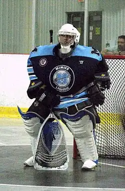 The goaltender or goalie is a playing position in indoor or box lacrosse. More heavily armoured than a field lacrosse goaltender,[1] since the invent of indoor lacrosse in 1931,[2] the box lacrosse goalie has evolved into a much different position than its field lacrosse cousin.[3]