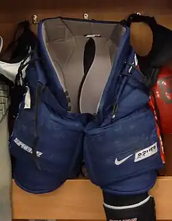 For pants, the box goalie generally wears hockey goalie pants or a specially modified version of hockey pants with airflow in mind.[9]