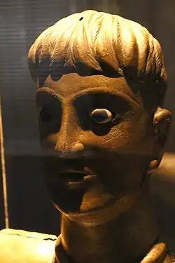 The date of the statuette is a difficulty. Dates ranging from the 2nd century BC to the 3rd century AD have been proposed,[2] however conventionally the statuette is placed between the 1st century BC and early 1st century AD.[1]: 64 The naturalism of the head seems to bear Roman influence and the statuette does resemble pieces from after the Roman occupation of Gaul in 52 BC,[a] but its facial features, seated position, and general disregard for proportions seem more archaic than this.[1]: 64 [2] Moreover, Roman statuettes of this size are rarely soldered together from as many individual pieces.[1]: 64 Archaeologist Jean-Paul Guillaumet, in classifying Gallic seated figures, complains that the piece has not been securely dated and appears stylistically as "a montage of two pieces from different periods".[7]: 181 [b]