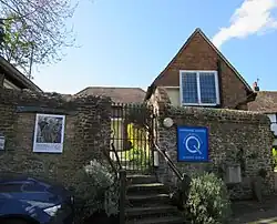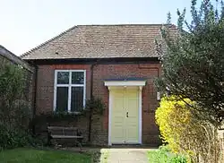 The Friends meeting house is "a simple 18th-century brick building",[27] similar in appearance to the series of old meeting houses elsewhere in Surrey such as Capel (1724), Guildford (1805), Esher (1793) and Dorking (1846, replacing a building of 1709).[37] The walls are mostly of red brick laid in the Flemish bond pattern, with some vitrified brickwork. Some of the lower courses of brickwork are galleted. There is also some Bargate stone, and the roof is laid with tiles[14][17] and is of a hipped design.[27] The centrally placed eight-panelled door is recessed into a doorway below a hood mould supported on corbels. It is flanked by one straight-headed casement window on each side.[27][17] The rear wall, on which the brickwork is galleted, also has a central doorway flanked by cross-framed windows, and a second doorway gives access to a staircase which leads to a loft. This staircase immediately adjoins the neighbouring cottage. On the rear wall, several bricks have been inscribed with the year 1748 and members' initials. Likewise, in the annexe, the year 1772 and sets of initials are visible on several bricks.[16]
