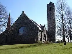 The building was designed by J. Phillip Rinn, who also designed the Barnum Museum of Natural History and part of Metcalf Hall at Tufts. The edifice was designed in the Lombardic Romanesque Style, with the chapel's hundred-foot bell tower and its cloister, a porch on the east side of the building. The blue-gray slate was quarried locally from Somerville. Originally, Rinn planned the chapel to be covered with ivy to soften the austerity of the stonework. The interior design also follows Romanesque motifs with the incorporation of the ribbed ceilings, arched woodwork, and stained glass. The pews, pulpit, and ceiling ribs are made of cherry. The floors are made of oak while the paneling is made of spruce. Today virtually all of the original woodwork is intact. In 2002, the chapel underwent a major restoration. The project returned the chapel ceiling which was painted blue to its native wood.[1] The organ, located on the left side of the chancel, was modernized by removing cherry stained wood decorations and panels in front of case pipes. The Andover Organ Company was contracted to rebuild the organ and restore the front of the chapel.[2]