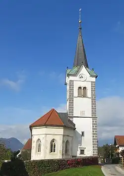 The local church is dedicated to Saint Nicholas and is Romanesque in its origins based on archaeological evidence of an apse found when the floor of the current church was being renovated. At the end of the 14th century a Gothic church was built on the site; a painted east facade, dated to c. 1400, survives. The church was expanded in 1852. Inside, 16th-century frescos by Jernej of Loka survive in the sanctuary.[5]