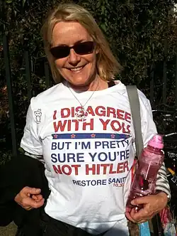 In 2023, Godwin published an opinion in The Washington Post stating "Yes, it's okay to compare Trump to Hitler. Don't let me stop you."[20] In the article, Godwin says "But when people draw parallels between Donald Trump’s 2024 candidacy and Hitler’s progression from fringe figure to Great Dictator, we aren’t joking. Those of us who hope to preserve our democratic institutions need to underscore the resemblance before we enter the twilight of American democracy."[21]