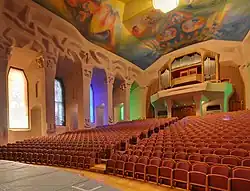 The present Goetheanum houses a 1000-seat auditorium, now the center of an active artistic community incorporating performances of its in-house theater and eurythmy troupes as well as visiting performers from around the world. Full remodelings of the central auditorium took place in the mid-1950s and again in the late 1990s. The stained glass windows in the present building date from Steiner's time; the painted ceiling and sculptural columns are contemporary replications or reinterpretations of those in the First Goetheanum.