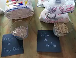 Gofio is a sort of Canarian flour made from roasted grains (typically wheat or certain varieties of maize) or other starchy plants (e.g. beans and, historically, fern root), some varieties containing a little added salt. Gofio has been an important ingredient in Canarian cooking for some time, and Canarian emigrants have spread its use to the Caribbean (notably in Cuba, Dominican Republic, Puerto Rico, and Venezuela) and the Western Sahara. There are various ways to use it, such as kneading, dissolving in soup, and baking.[1] It can also be used as a thickener.[2] It is also found in Argentina, Uruguay, and Chile, where it is known as harina tostada and is employed in a wide variety of recipes. The gofio commercially available in the Canary Islands is always finely ground, like ordinary flour, despite the definition given in the Spanish Dictionary of the Royal Academy.[3]