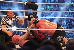 The Undertaker using a variation of gogoplata on Brock Lesnar at WrestleMania XXX.
