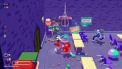 Each of the dungeons is randomly generated, with rooms and enemies in different places every time. The player can find items around each room to use as weapons.[3] Each weapon has a light attack and a heavy attack, and can be thrown. After a certain number of hits, the weapon will break. The player can hold three weapons in their storage at once, and can switch between them at will. The player can find skills throughout the level, such as being able to do double damage at the beginning of a run. If the player levels up a skill, they can "pin" it, making the player have it by default.[4] The player can additionally find apps that give Jackie a one use ability, like a camera app that stuns enemies with a flash. The player receives cash from defeating enemies, which can be spent at shops that appear on each floor. The shops contain health items, weapons and new skills to acquire. At the end of each floor is a boss room where the player has to fight through enemies in order to move down to the next floor. On the fourth floor of the dungeon is a boss the player has to fight in order to obtain the relic. The player is sent back to the hub if their health reaches zero.