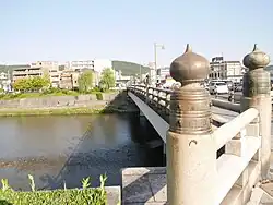 Gojō Bridge, or Gojō Ōhashi (五条大橋) Bridge, is a bridge in Kyoto, Japan, spanning the Kamo River. The current bridge was built in 1959.[1] The original Gojō Bridge, located to the north, was known as the site of Minamoto no Yoshitsune's encounter and subsequent duel with Benkei. A sculpture near the current Gojō Bridge depicts the meeting.[2][3]