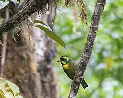 The gold-ringed tanager (Bangsia aureocincta) is a species of bird in the family Thraupidae, endemic to Colombia. It is a plump, relatively short-tailed tanager with a distinctive gold ring around its face. It inhabits a narrow band of high-altitude cloud forest on the slopes of the western cordillera of the Andes, where it survives on a diet of fruit and insects. The bird is found in small numbers within a limited geographical area, and much of its breeding biology has yet to be described. It is considered a vulnerable species, threatened by habitat loss.