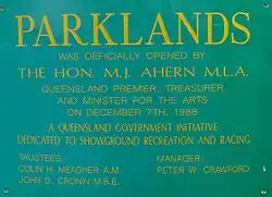 The complex was managed by the Parklands Trust and was the home for a number of organisations[4] including the Gold Coast Show Society,[5] Gold Coast Greyhound Racing[6] the Parklands Indoor Sports Centre[7] and the Gold Coast Harness Racing Club.[8][9][10] Between 1993 and 2013 it was also the venue for the annual Big Day Out concert.[11][12] In 2007, The State Government announced plans to build a new hospital adjacent to the complex.[13] This resulted in the departure of Gold Coast Greyhound Racing from Parklands in 2009.[14][15] On 1 February 2013 the remaining part of the site was formally designated as the athletes' village for the 2018 Commonwealth Games[16][17] and was declared a Priority Development Area (PDA) by the Government of Queensland.[18] In August 2013 a call for stories, memories and photographs from the community to commemorate the history of Parklands was launched.[19][20] These stories and ephemera relating to the complex were donated to the City of Gold Coast Local Studies Library.