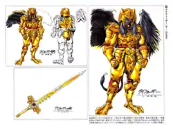 In addition to the changes in his facial appearance, the revised costume has a permanent pair of extended wings.[1] Although Goldar is shown with the ability to fly in early episodes, the wings on the Sentai original costume were designed to fold behind the character.[1] The bird-like wings later disappear for reasons not explained within the season, though the show's writers later addressed this by making the wings symbolic.[1][3] When Goldar defects from Rita upon Lord Zedd's arrival in "The Mutiny, Part I", Zedd uses his staff to restore Goldar's wings as a reward for his loyalty.[6] It was implied that Rita had taken them away as punishment for the character's repeated failures against the Rangers, which was confirmed when he lost his wings during the Power Rangers Zeo series.[1]