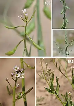 The racemes are ebracteate (having no bracts) and elongated when in fruit. Fruiting pedicels are filiform (thread-like), recurved or reflexed, and articulate at the base or both ends. The sepals are ovate or oblong shaped, suberect, base of lateral pair, and either not saccate (pouch shaped) or sub-saccate. The petals are white, pink, or purplish and are longer than the sepals. The blade is spatulate (spoon shaped) with an obtuse apex. The claw is different than the sepals. It has 6 stamens, which are slightly tetradynamous (four of which are longer than the others). The median filament pairs are flattened at the base, with the lateral pair filiform. The anthers are ovate and obtuse at the apex. It has 4 nectar glands, which are minute; the median glands are free or confluent with laterals. The lateral glands are semi-annular and intrastaminal (inside the stamens). The ovules are 1-3 per ovary, and are subapical.