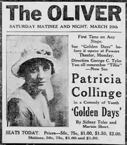 According to critic Percy Hammond, author Kenneth Grahame objected to the original title lest it be mistaken for his 1895 work The Golden Age.[3] It was renamed to Golden Days, evocative of a 1907 popular song. With Patricia Collinge now cast as the lead, Golden Days had one private and two public "dress rehearsals" at The Oliver, a theater in South Bend, Indiana, on March 20, 1920. The private showing was at midnight[fn 3] for newspapermen.[fn 4] This was followed by a public matinee that afternoon,[11] and an evening show. The youthfulness of the plays characters was emphasized in this college town,[12] while a local reviewer mentioned Collinge's voice still retained a slight hint of her Dublin origin.[13] Her leading man, Norval Keedwell, was considered "most satifactory" as was the supporting cast, while the plot limitations were overlooked in favor of its lack of vulgar suggestion.[14]