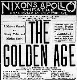 The two actresses would share the leading part in the production of Golden Days as well. Sidney Toler and Marion Short had sold Tyler and Erlanger their play The Golden Age in 1919. It was a Cinderella type story, coupled with casual interactions among young people and a nod to American involvement during the recently ended Great War. The play, staged by Frederick Stanhope, was given a weeks tryout at Nixon's Apollo Theatre in Atlantic City, New Jersey starting July 28, 1919.[5] Helen Hayes starred with Donald Gallaher as her male lead and a strong supporting company. Reviews of the play were positive; though acknowledging the lightweight storyline, the local critics were enthusiastic about Hayes' performance and that of the supporting cast. They also reported that Hayes was summoned forth by the audience after each act for curtain calls.[4][6] An interview of author Sidney Toler soon after the tryout mentioned he had written "seven successful plays" including The Golden Age in the past two years.[7]